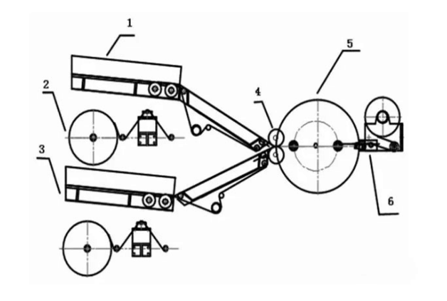 1.正極片送料機構2.隔膜放卷機構3.負極片送料機構4.軋壓輥5.卷繞機構6.封貼及切斷機構